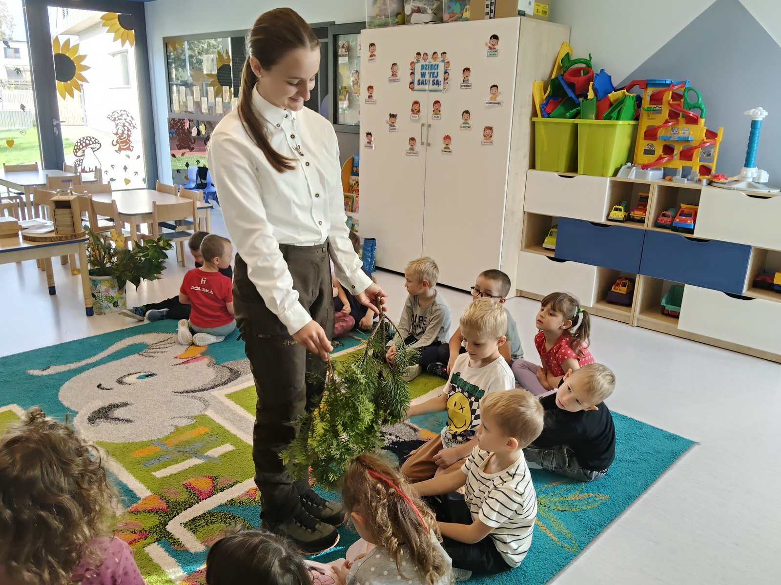 Dnia 13.10.2025r., w naszym przedszkolu odbyło się spotkanie dzieci z leśnikiem. Podczas wizyty pani leśnik opowiedział przedszkolakom o swojej pracy, zwierzętach leśnych oraz o tym, jak dbać o przyrodę. Dzieci miały okazję zobaczyć różne eksponaty. Spotkanie było bardzo ciekawe i edukacyjne – dzieci z dużym zainteresowaniem słuchały opowieści, zadawały pytania i dzieliły się własnymi spostrzeżeniami. Spotkanie było doskonałą okazją do poszerzenia wiedzy o lesie i budowania postawy szacunku wobec natury...